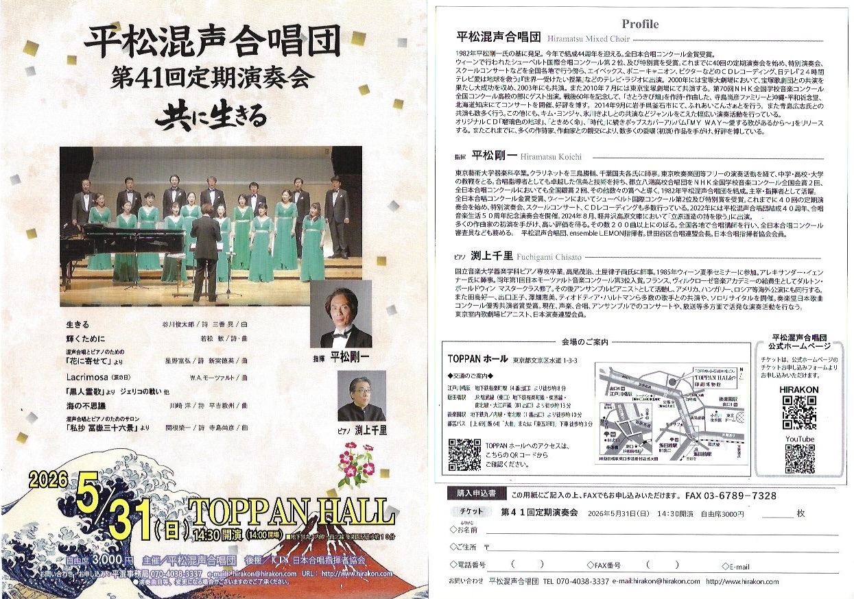 - 指揮:平松剛一 東京藝術大学器楽科卒業。クラリネットを三島勝輔、千葉国夫各氏に師事。東京吹奏楽団等のフリーの音楽活動を経て、中学、高校、大学の教鞭をとる。 合唱指揮者としても卓越した信条と技術を持ち、都立八潮高校合唱団をNHK全国学校音楽コンクール全国金賞2回、全日本合唱コンクールにおいても全国銀賞2回、その他数々の賞へと導く。 1982年平松混声合唱団を結成。主宰・指揮者として活躍。全日本合唱コンクール金賞受賞。ウィーンにおいて、シューベルト国際合唱コンクール第2位入賞、及び特別賞を受賞。これまでに定期演奏会、特別演奏会を始め、スクール コンサート、CDレコーディングも多数行っている。2022年には平松混声合唱団結成40周年、合唱音楽生活50周年記念演奏会を開催する。 また多くの作曲家の初演を手がけ、高い評価を得る。その数、200曲以上にのぼる。 全国各地で合唱指導を行い、全日本合唱コンクール審査員なども務める。平松混声合唱団、ensemble LEMON 指揮者。世田谷区合唱連盟会長、日本合唱指揮者協会会員。
